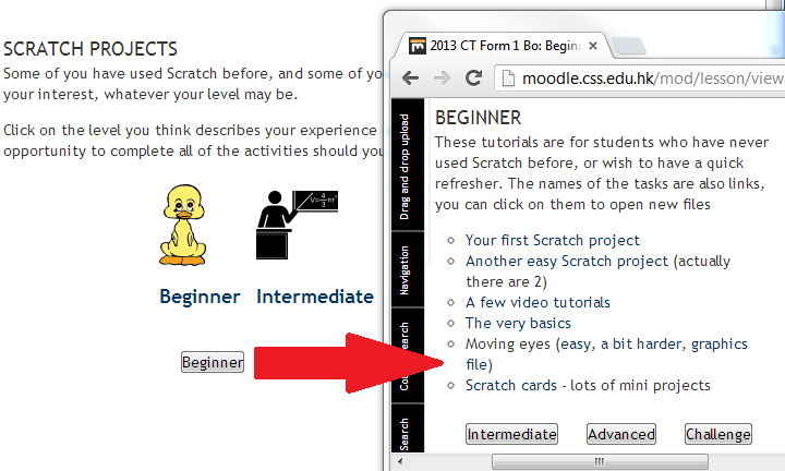 This activity is a very simple use of the ‘lesson’ module. There is no questioning involved, simply a series of links to great Scratch 1.4 tutorials, organised by level of proficiency. The ‘book’ module would have probably been better for this, but I don’t have it installed on my (old now) Moodle 2.2 version.