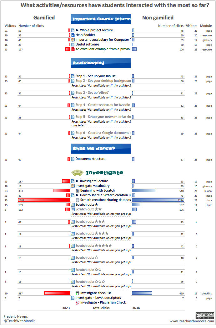 I was rather surprised to see that students enrolled in the non-gamified course have interacted with activities & resources more than the students enrolled in the gamified course (3,634 clicks vs 3,423), as it contradicts figures gathered in week 1 of the experiment. However, the figures above only show clicks to resources & activities, and do notinclude visits to the course homepage, to check if badges have been unlocked, for example.