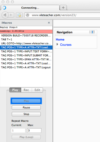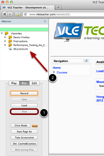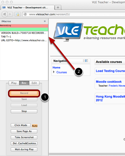 iMacros records your web browsing activity so that you can later simulate the actions of a real Moodle user, all automatically. For example, you start up Firefox and set iMacros to record. You go about your daily business on Moodle as normal (e.g. login, view your course, add an assignment, answer some forum posts and logout), iMacros keeps a record of everything you click on during your session, including all the forms that you fill in until you press ‘Stop recording’. Those steps are saved in a macro, which you can then play back later by opening that macro. This means that you can press the ‘play’ button and Firefox will repeat all of the steps that you did during your session, without any more interactions from your part, thus automatically simulating the web browsing activities of a Moodle user. You can ‘loop’ the action to repeat it automatically as many times as you like.