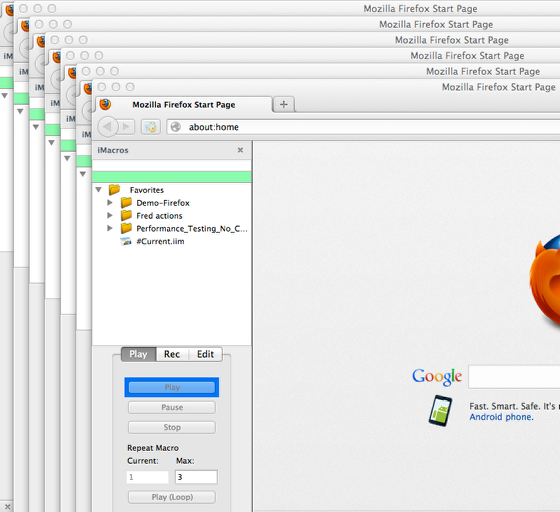 The macro you recorded will only mimic one user when you play it – hardly useful for load testing. To mimic multiple users at once, you will need to run multiple instances of the macro at the same time. Note that using different tabs will not work, you have to open each new instance of Firefox in its own window. (Ctrl N on Windows/Linux, or Cmd N on Mac). The only limitation is the amount of instances your computer can cope with in terms of CPU/RAM and bandwidth.