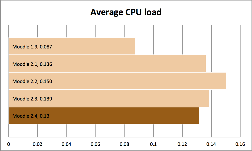 On average, Moodle 2.4 uses 6.5% less CPU than Moodle 2.3. From experience, CPU is rarely the first thing that needs upgrading on a Moodle server but it’s nice to see an improvement in this area.