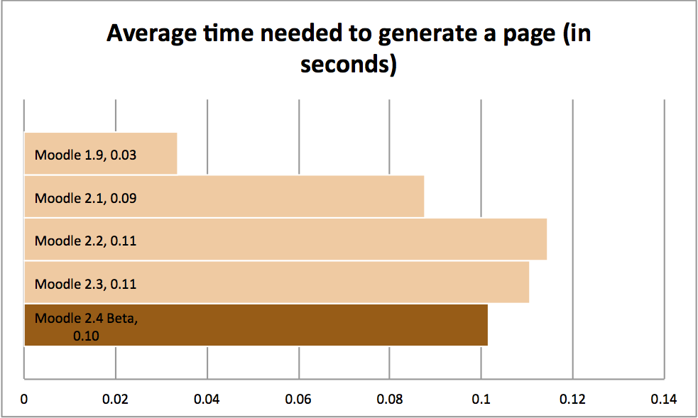 On average, it takes 25 fewer files to generate a Moodle 2.4 page compared with Moodle 2.3. This equates to a 9.1% improvement over Moodle 2.3. Each file needs to be collected from the disk before it can be processed by the CPU to generate a page, so the less files to be collected, the better.