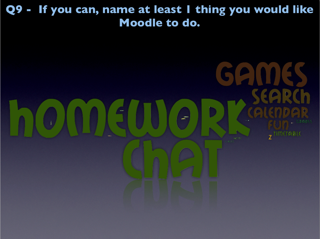 The main comments here refer to ‘Homework’ as you can see. This does not mean that students were silly in their answers and expect Moodle to do their homework for them (I’m actually surprised nobody answered that :)). We have a student database at my current school, which includes a ‘homework database’, where teachers record due homework and assignments. Students would like to see a merging of the two systems, or at least a better integration between the two – my next job on my TODO list. Students want more games and a ‘Chat’ system. I’ll run INSET on how to use the ‘Game’ module in a couple of weeks but don’t know what to make of the ‘Chat’ features. If you have any feedback on this, I’ll be glad to hear what your thoughts/experience are on this.