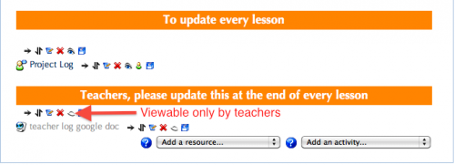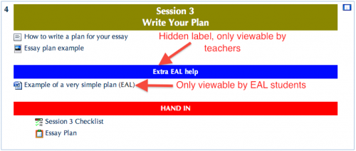 In the same vein as the last tip, using groups and groupings you could make labels that are only viewable by teachers. This can be useful for day-to-day organisation, to document your teaching and warn other teachers of important things to do, but which are useless to students. For example, the Humanities department at my current school run a yearly project, and Moodle is used as a central repository/teaching tool. This Moodle course is used by 6 teachers and students go to each teacher on different days. Using hidden labels allowed us to communicate very important information e.g. ‘Mr X, please update this!’, whilst this can be achieved using web pages, labels are more prominent and harder to miss.
