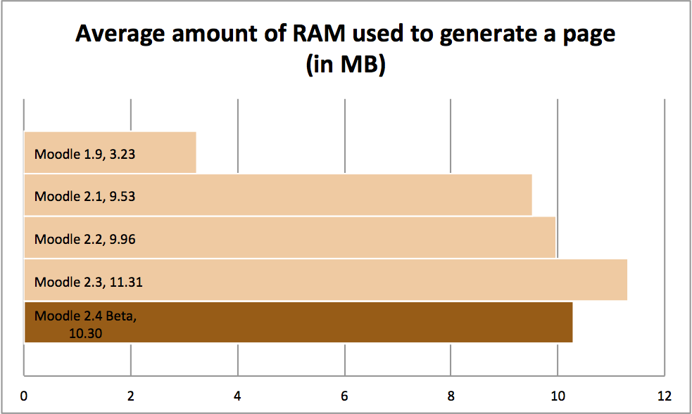 On average, I found that Moodle 2.4 uses 8.9% less RAM to generate pages than Moodle 2.3. This is great news considering that, for a large amount of Moodle servers, is the first thing that needs upgraded when usage increases. Moodle is very ‘RAM hungry’.