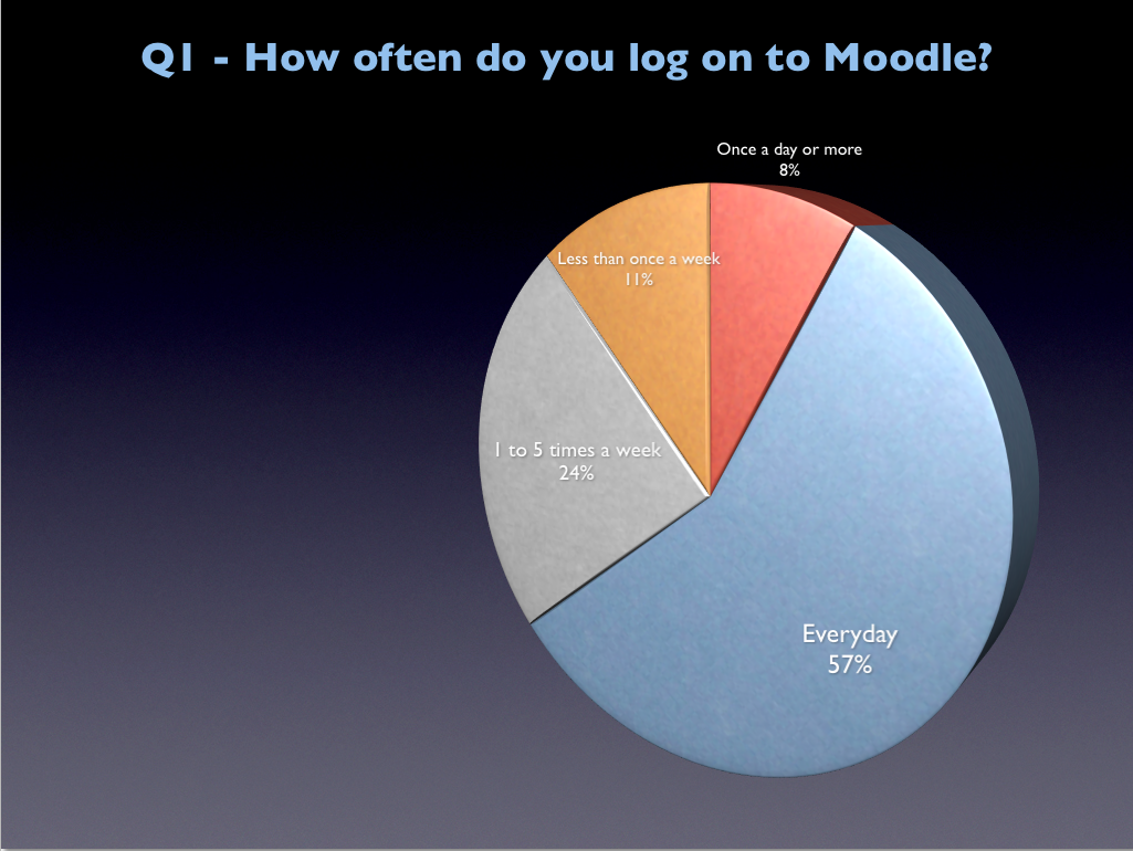 This one I already knew the answers to simply by looking at the site logs, but it is always nice to see what the students actually perceive their usage of Moodle to be. It turns out that students underestimate their use slightly. 90% of students log on at least once a week, with 2/3 at least once a day.