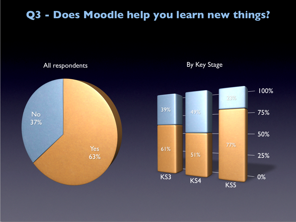 It is interesting to note that answers varied wildly between Key Stages. Courses tend to be much more difficult between KS3 and KS4 (exams at the end of KS4) and that might explain why half of KS4 students felt that Moodle is not a good first-hand learning tool.