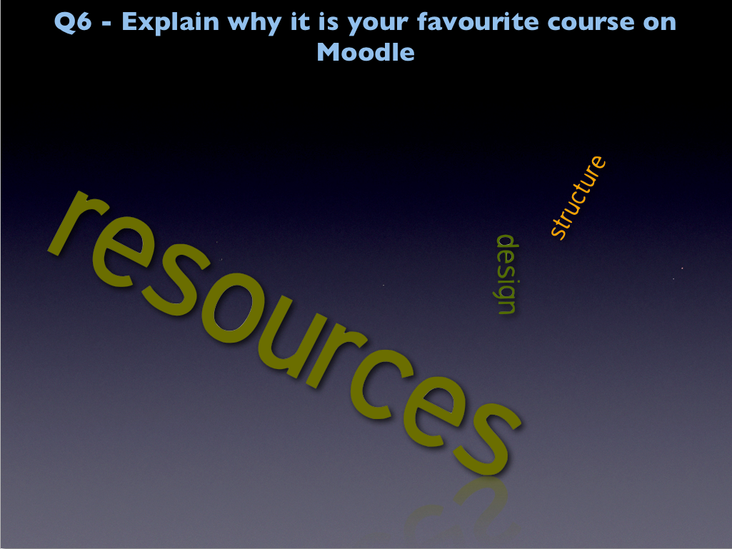 Students were required to write sentences. I read all of the answers and assigned keywords to each of them and then sent those keywords to wordle.net to generate a word cloud (bigger words are mentioned more often). Students like well-resourced (mostly documents used in lessons), clearly organised (labels used for units) and colourful courses (pictures, coloured labels, etc.). No surprises here, apart that I was expecting more mention of ‘forums’, ‘blogs’ and participative tools. Maybe students see these as a given?
