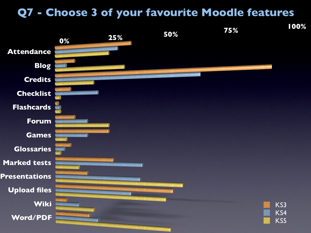 I conducted a survey at my current previous school (December 2010) and am sharing some of the results here. Some of the results confirmed findings through observation, some were obvious, others not so much. I used the ‘Questionnaire‘module to create and deliver the survey (all through Moodle) and then exported the results to Excel to perform a more refined analysis than the module would allow. Unfortunately, for privacy reasons I cannot release all of the results.