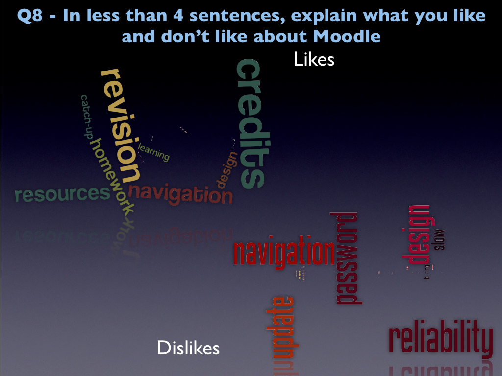 This question left me puzzled for a while. How can ‘Navigation’ be both a ‘like’ and a ‘dislike’. After re-reading the comments, it turns out that some students complained about actual course pages not being organised properly (lack labels, unit names, etc.). So teachers, beware – organise your courses! I was also most surprised that reliability is the main issue students complained about, yet nobody ever comes to see me about it. I’ll need to investigate further when coming back from holidays. Most students complained that some courses are not updated often and do not reflect all of the hard work that goes on in lessons. Overall, the comments were very positive and students value Moodle as a great learning/revision tool. One thing that really surprised me was that a lot of students do not like ‘enrollment keys’ and would like to be able to view all courses on Moodle…
